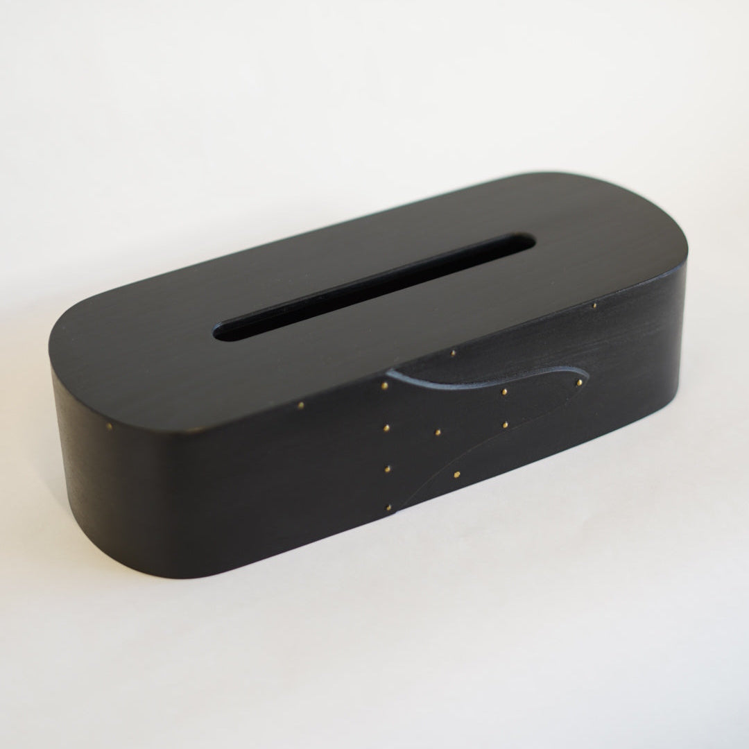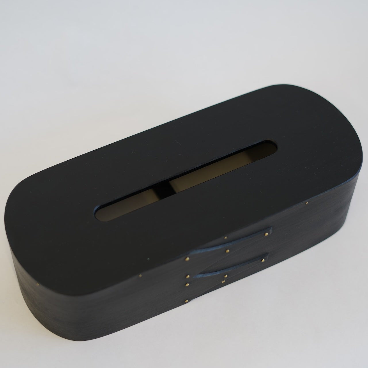 オーバルボックスの作り方を元に制作されたティッシュケースカバー。裏側にはティッシュボックスを固定するためのレザーベルトと真鍮パーツが取り付けされています。側面を止める技法の使用として燕尾型のスワローテールと剣型ソードの2種類をご用意しております。