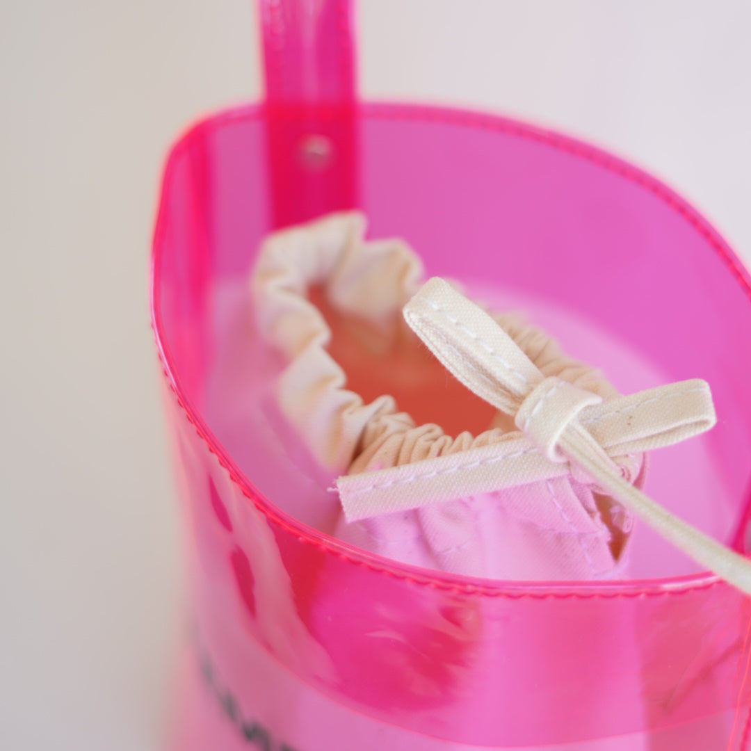 透明のPVC素材を使用し,バゲットを入れるためのトートバッグのミニサイズ。 500mlのペットボトルが入るサイズです。 内側のキャンバスの袋は、取り外して使うこともできます。 濡れても汚れてもサッと拭き取れるので、安心です。